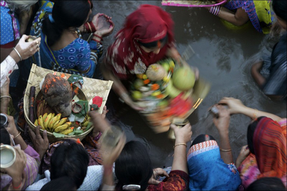Colorful photos from the celebrations of the festival Chhath Puja or Surya, which was held in India last week. During the festival Hindus worship the god of the sun and fasted all day to ensure the welfare of his family and friends. Surya Puja is celebrated twice a year - once in summer (May-July) Chaiti Chhath, and once in October and November - Kartik Chhath, which is celebrated six days after the festival of Deepavali. First day began with a ritual bathing (preferably in the river Ganges), and then the faithful abstain from work at home and fast for four days.